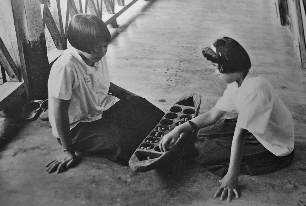 Anak-anak Thailand bermain congklak. Permainan congklak di Thailand berasal dari Champa dan Siam. Sumber gambar : https://en.m.wikipedia.org/wiki/List_of_mancala_games#/media/File%3AThai-girls-playing-with-mancala-board-possibly-main-chakot-or-mak-khom.jpg