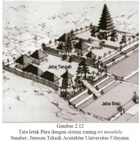 Pembagian mandala menjadi 3 bagian adalah bagian dari seni arsitektur tradisi Indonesia asli. Pembagian wilayah menjadi 3 bagian ini bukan hanya terdapat di Bali tapi juga di bangunan-bangunan kuno seperti keraton, masjid dan makam kuno yang masih mempertahankan bentuk bangunan tradisi Indonesia yang tersebar di seluruh Indonesia.